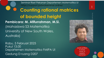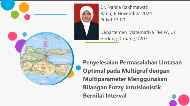 Seminar Riset Pekanan Departemen Matematika Universitas Indonesia “Penyelesaian Permasalahan Lintasan Optimal pada Multigraf dengan Multiparameter Menggunakan Bilangan Fuzzy Intuisionistik Bernilai Interval” Pembicara: Dr. Nahlia Rakhmawati Hari Rabu, 6 November 2024 pukul 13.00di ruang D207 Gedung DFakultas Matematika dan Ilmu Pengetahuan…