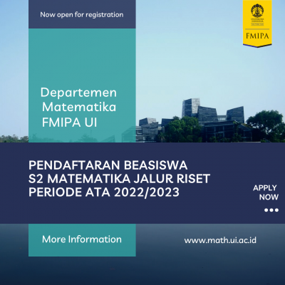 The Department of Mathematics provides scholarship opportunities for new graduates of S1 Mathematics/S1 Statistics/S1 Actuarial FMIPA UI to continue their S2 Mathematics Research Path Study for the ATA 2022/2023 Period. This scholarship includes the cost of Initial Fee (UP) and Education Operational Fee (BOP) for 3 semesters with applicable terms and conditions.